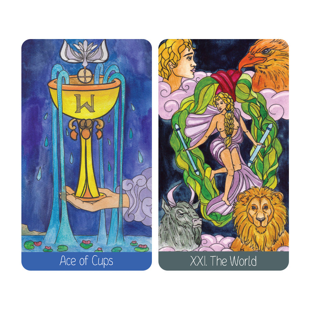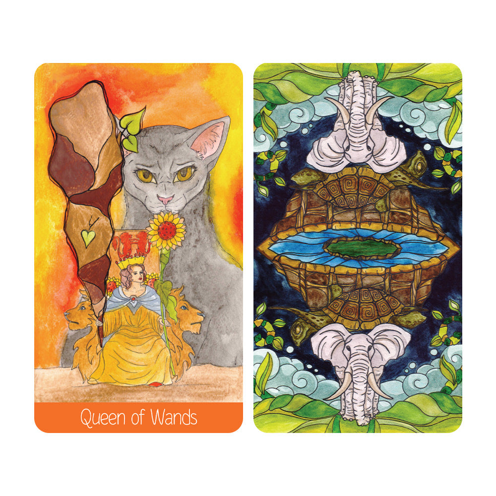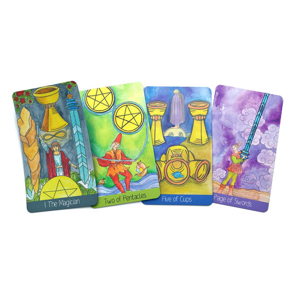 Our new Reverse Scale Tarot deck generally follows the symbolic meaning of Waite’s Tarot. What makes the Reverse Scale Tarot deck different from the traditional one is a special ratio of the human figures size and that of the objects.Thus; people appear much smaller than the suit symbols, plants, animals and other supporting creatures. The new deck, painted in watercolor, is also created by Michel Tarnopovich , who offered a more serious and profound idea underlying the images. A human comes weaker and more humble against the whole world, where fate and circumstances often turn out to be stronger than him. Four suits are known to indicate four elements − earth, water, air and fire. To make working with deck more convenient, each suit differs in its symbolic color, which, in turn, corresponds to one of the elements. Thus, Wands represent the element of fire, their color is orange. Pentacles represent the element of the earth, their color is green. Swords represent the element of air, their color is lilac. Cups represent the element of water, their color is blue.