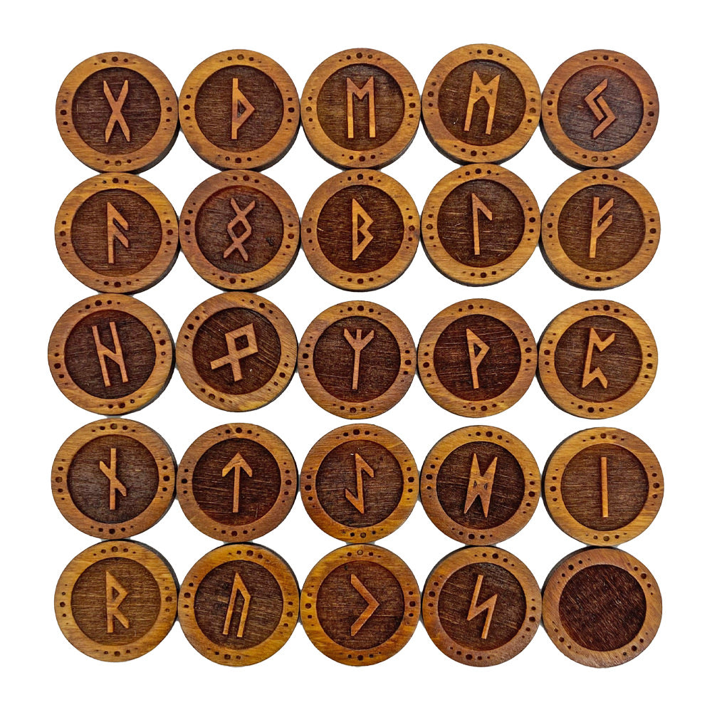 25 round tiles (24 Elder Futhark Runes + 1 empty tile) in a velvet pouch.